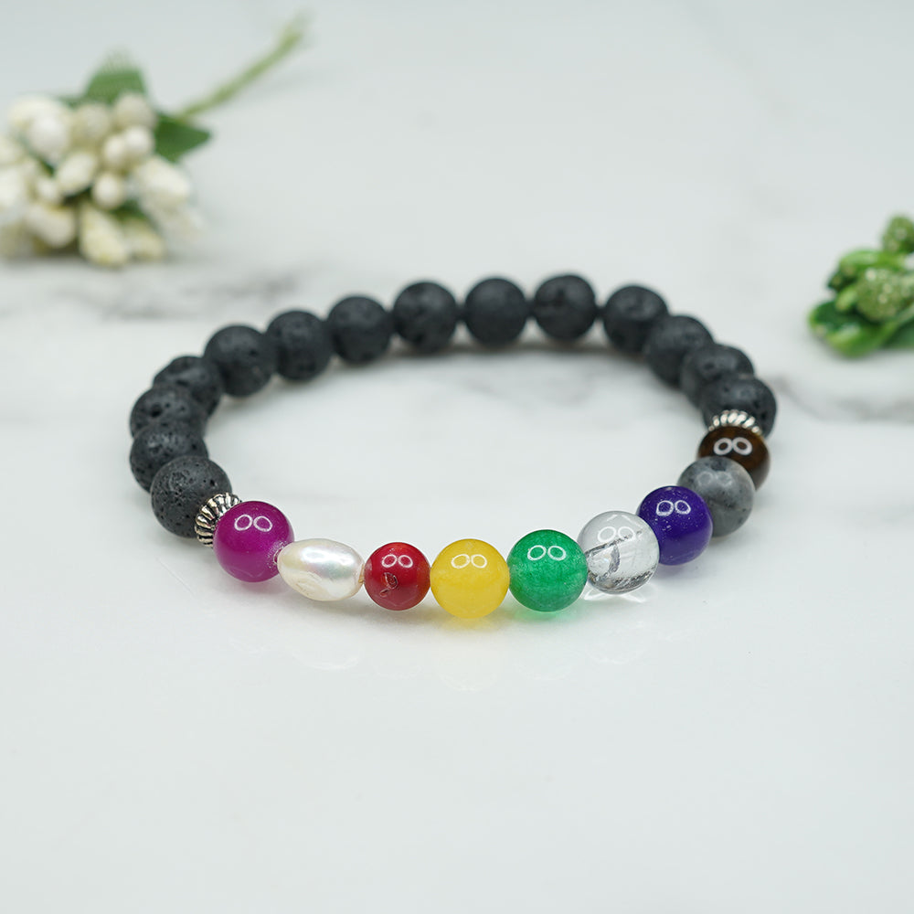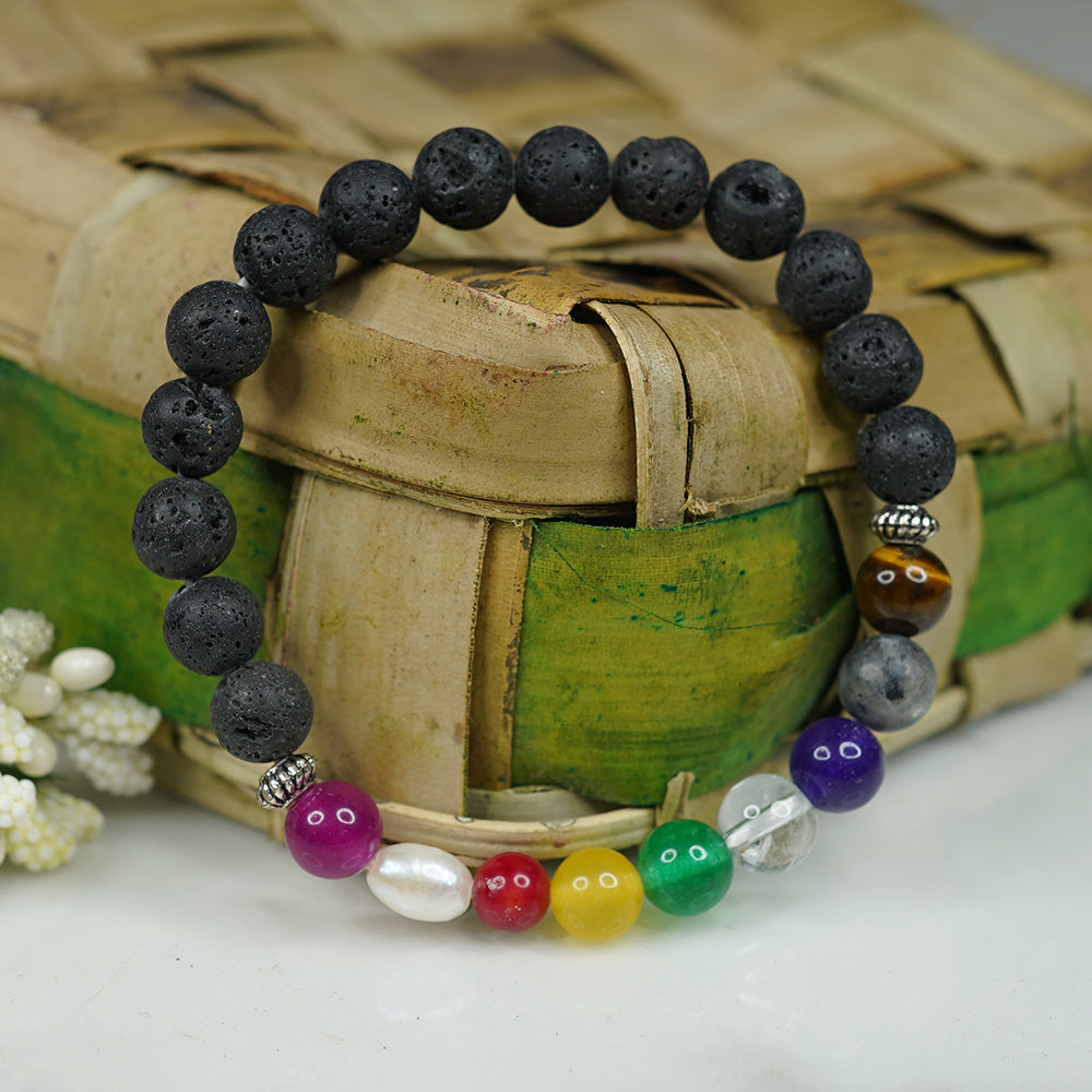 In this particular variation, the Navratna bracelet is combined with Lava Stones, offering additional aura protection and grounding properties.